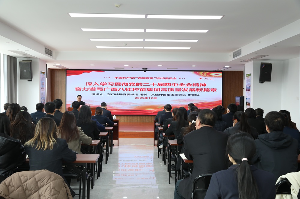 2025年12月26日,八桂种苗集团召开深入学习贯彻党的二十届四中全会精神宣讲会。东门林场党委书记、场长,八桂种苗集团董事长叶家义到集团作专题宣讲辅导。集团党支部书记、总经理詹定举主持会议,集团经营班子成员、职能部门全体人员及南宁片区组培厂负责人参加宣讲会。