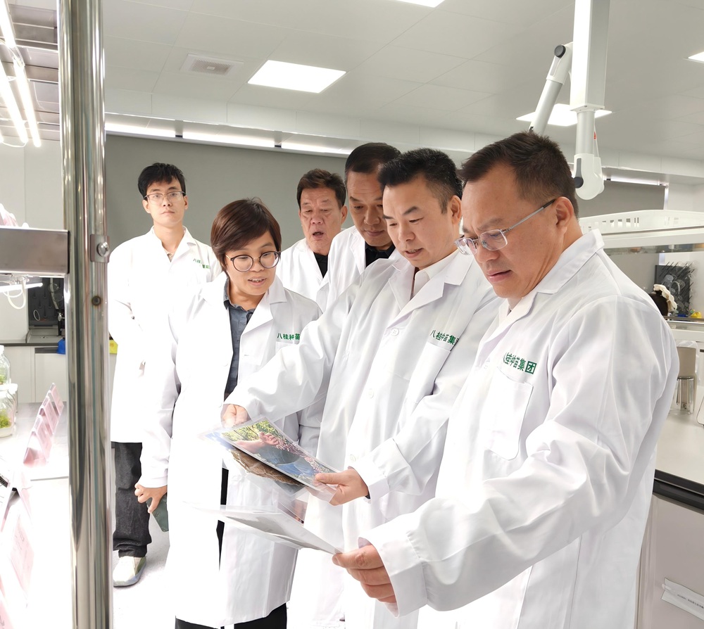 考察组先后实地查看了八桂种苗集团科教组培厂、林木生物技术和遗传育种实验室、智能温室大棚及良种苗木展示棚。 重点关注了组培苗标准化生产流程、实验室科研平台建设以及各类良种苗木的生长特性。在实地观摩过程中,八桂种苗集团副总经理、董事会秘书庞贞武还向杨劲松局长一行介绍了集团的核心技术优势,以及“四核多品”产品体系及AI赋能育种创新规划等内容。