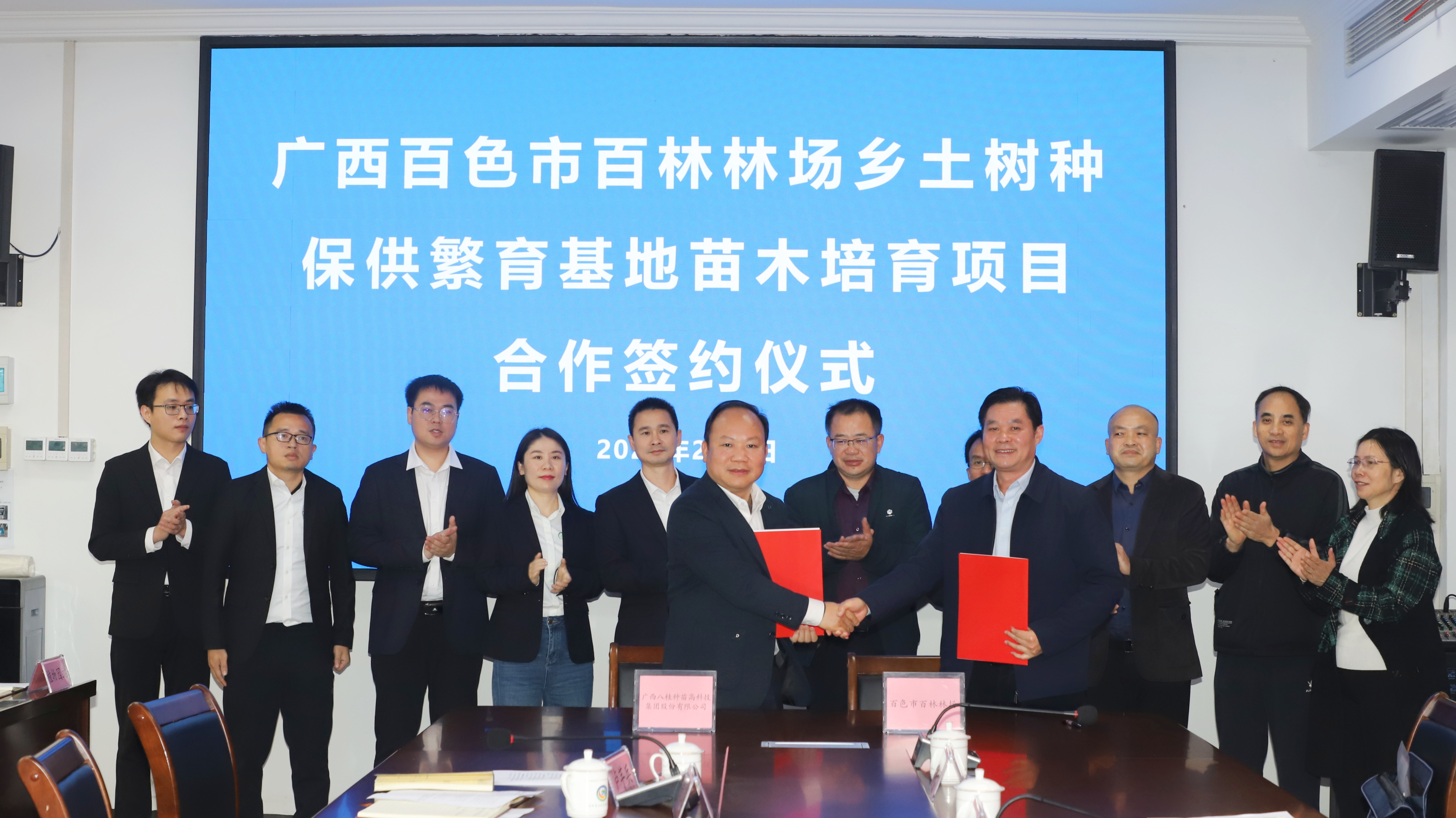 2026年2月5日,百色市百林林场(以下简称“百林林场”)与广西八桂种苗高科技集团股份有限公司(以下简称“八桂种苗集团”)在百色市举行“乡土树种保供繁育基地苗木培育项目”合作签约仪式。百林林场党总支书记、场长岑绍荣主持仪式。八桂种苗集团总经理詹定举、副总经理吴兵及集团相关部门负责人;百林林场领导班子成员及各科室、站所负责人共同参加签约仪式。